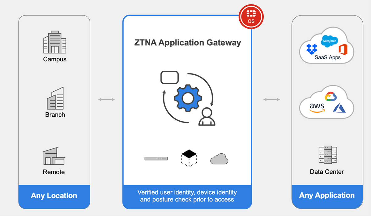 Las capacidades de ZTNA (Zero Trust Network Access) integradas aplican acceso seguro a aplicaciones e infraestructuras desde cualquier ubicación o dispositivo.