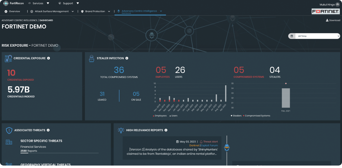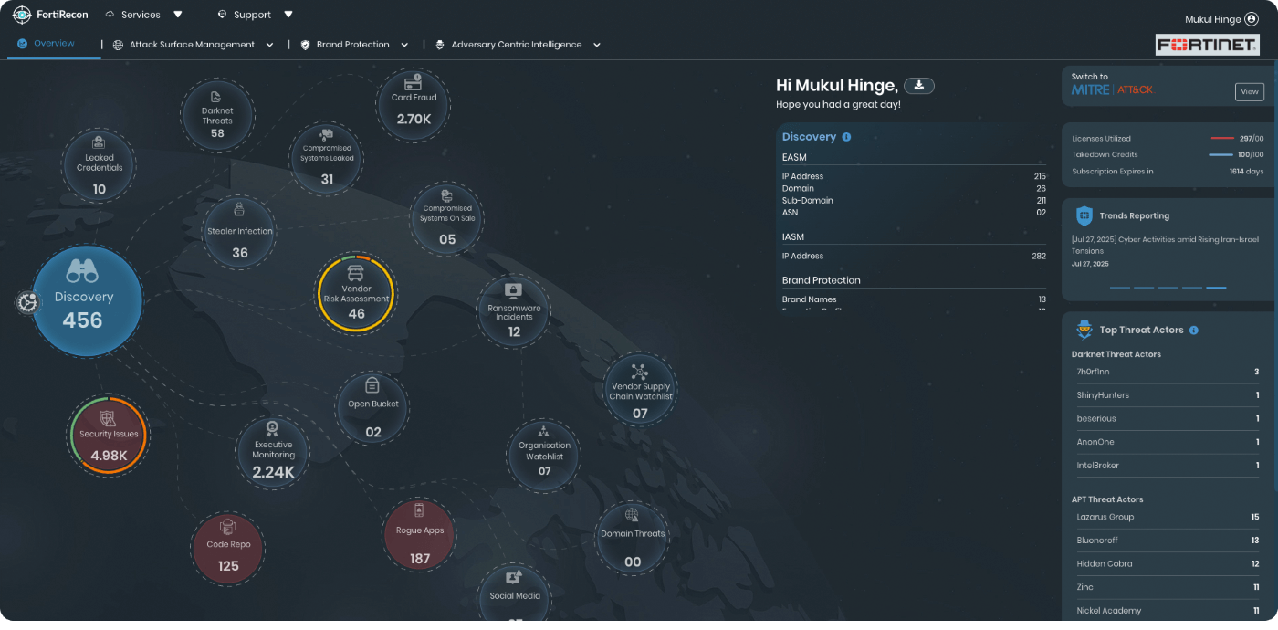 El módulo Attack Surface Management de FortiRecon supervisa de forma continua la superficie de ataque digital interna y externa de la organización, priorizando los riesgos y exposiciones detectadas.