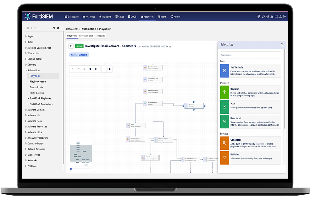 FortiSIEM combina la potencia de FortiSIEM y FortiSOAR en una única solución, aportando la simplicidad y eficiencia de la automatización SOAR a cualquier flujo de trabajo dentro del SIEM.