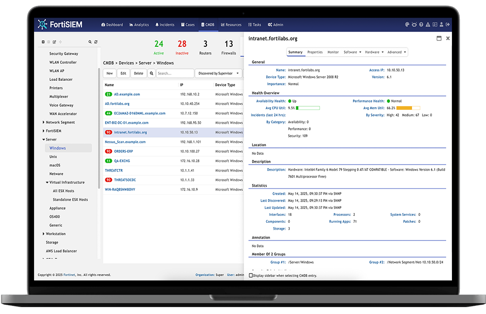 FortiSIEM incluye una CMDB completa para entornos IT y OT, diseñada para facilitar tanto el monitoreo del estado de los activos como las investigaciones de seguridad.