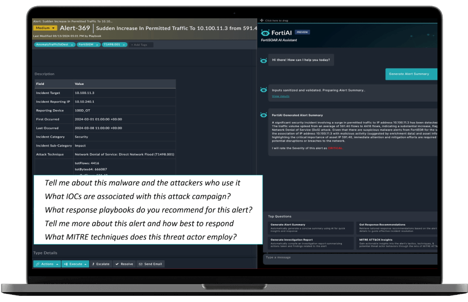 Integrado de forma nativa en la experiencia de FortiSOAR, FortiAI agiliza actividades como la investigación de amenazas, la respuesta ante incidentes y la creación de playbooks.