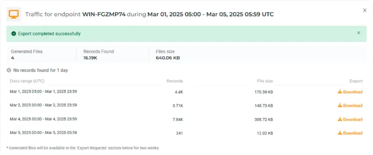 consultas y descargas ilimitadas e instantáneas de sus logs de red, para respaldar sus necesidades de seguridad.
