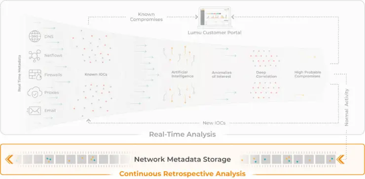 Lumu Defender analiza los metadatos de la red en tiempo real, detectando y respondiendo instantáneamente a las amenazas de la red. Luego, Archive aplica retrospectivamente nueva inteligencia de amenazas, incluyendo IoCs y descubrimientos de día cero (Zero-Day), a sus logs históricos, revelando compromisos no detectados previamente.