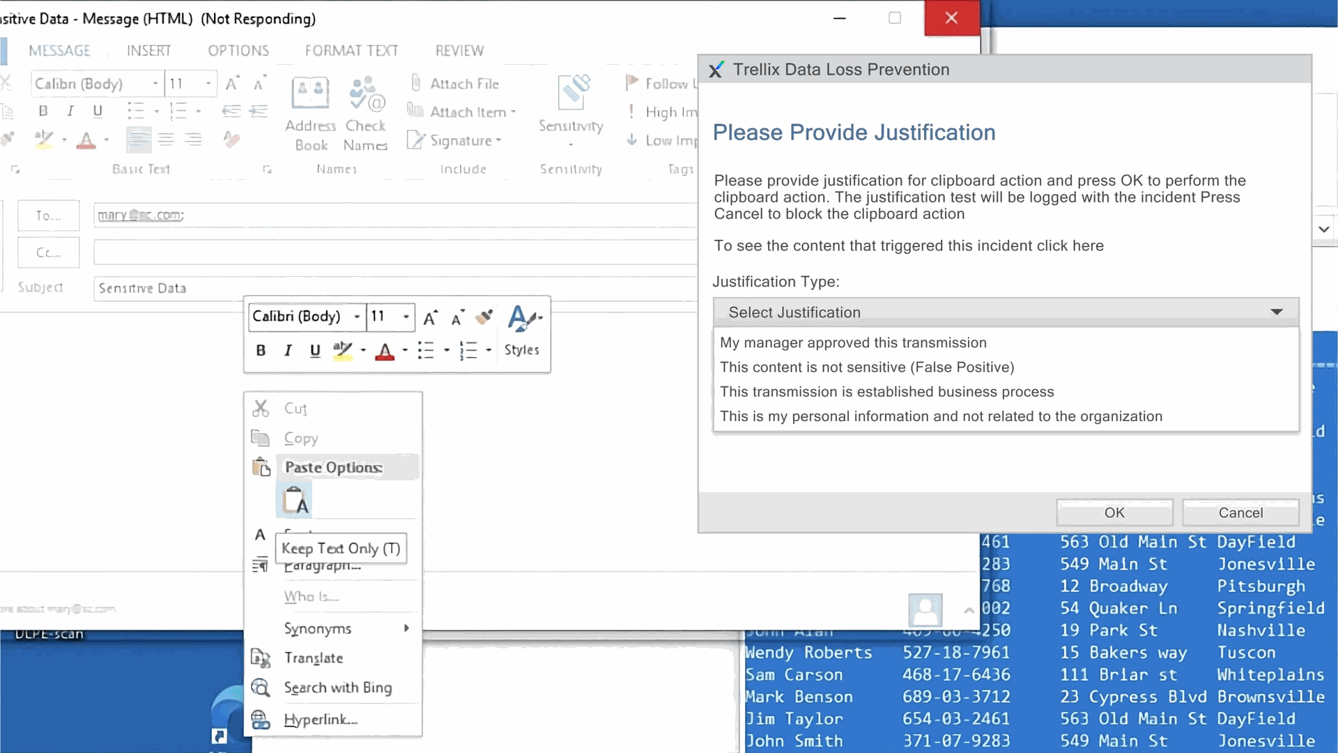 Evite la exfiltración de datos sin impactar la productividad del negocio. Trellix DLP le permite configurar notificaciones personalizadas que educan a los usuarios en tiempo real cuando intentan realizar una acción que viola las políticas de uso de datos. El sistema puede solicitarles una justificación, deteniendo posibles fugas de información mientras fomenta una cultura de seguridad más sólida.