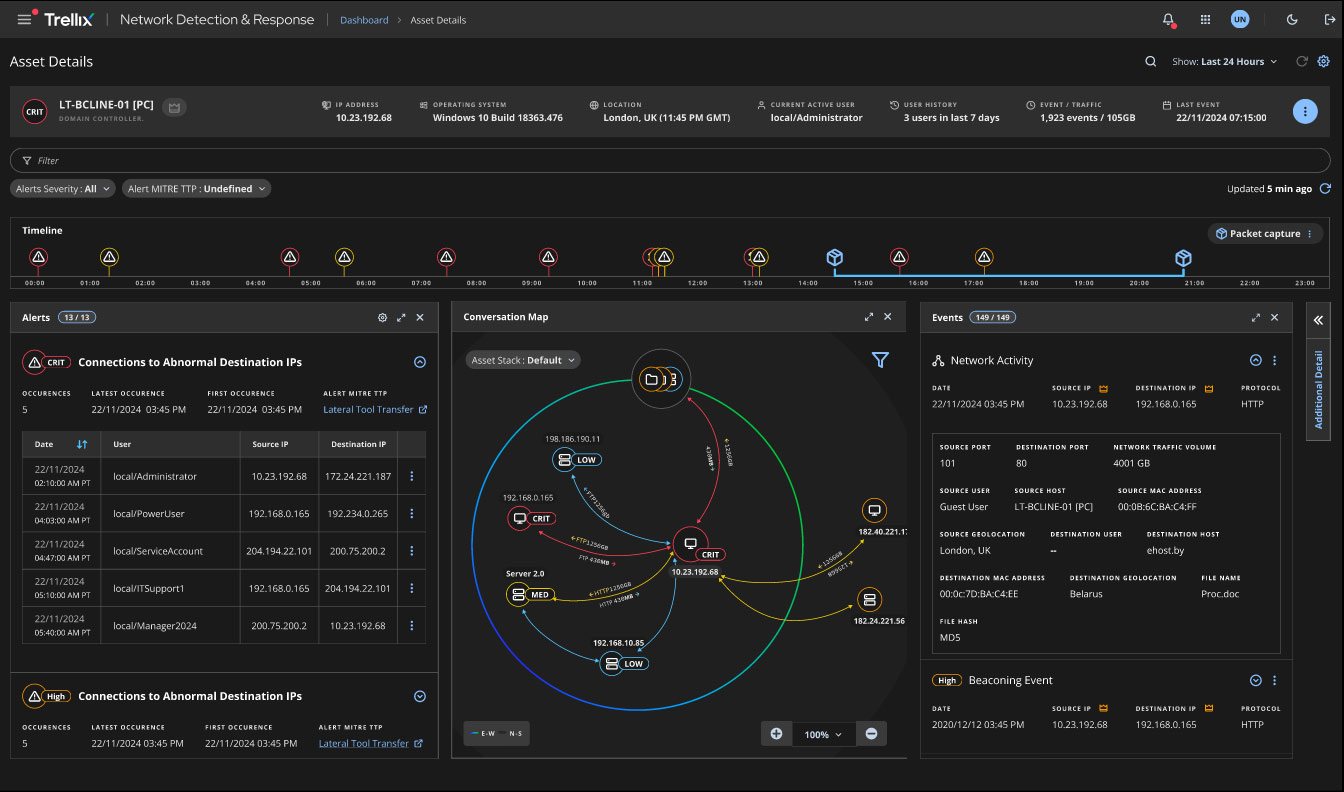 El grafo de conversación integrado revela relaciones de red tanto primarias como secundarias, permitiendo a los analistas identificar rápidamente posibles rutas de movimiento lateral. La visualización en línea de tiempo muestra la progresión de las alertas y los cambios en la actividad de red, proporcionando un contexto crucial para comprender la evolución de un ataque y los indicadores de compromiso del sistema.