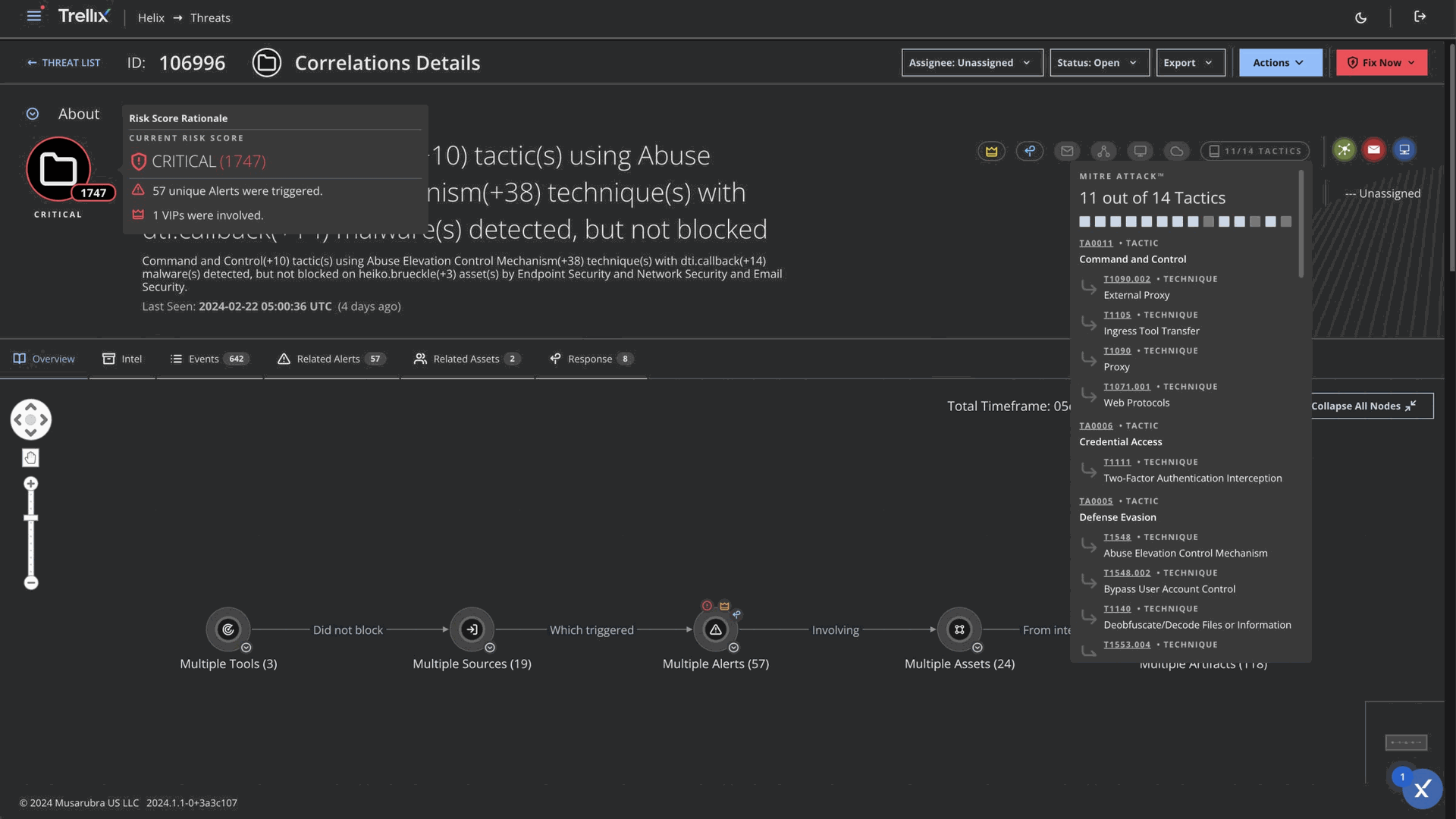 Los flujos de trabajo para la investigación de alertas proporcionan un contexto exhaustivo dentro de una única interfaz, eliminando la necesidad de alternar entre múltiples herramientas para el análisis de amenazas. La página mejorada de "Detalles de la Alerta" enriquece automáticamente cada evento con mapeos del framework MITRE ATT&CK, correlaciones con CVEs y contexto de inteligencia de amenazas. Adicionalmente, el grafo de conversación integrado visualiza las comunicaciones de red relacionadas con la alerta.